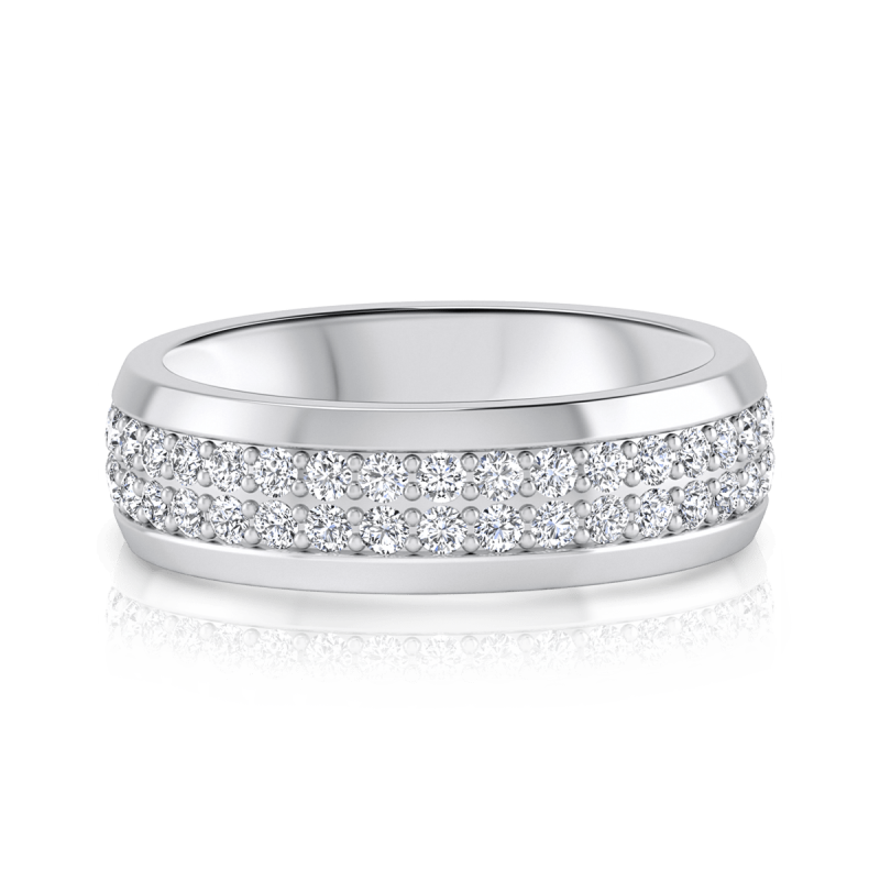 הטבעת עשויה 14K זהב, משובצת יהלומי מעבדה נוצצים באמצע הטבעת שתי שורות של יהלומים יוקרתיים סביב כל הטבעת הנותן מראה מיוחד. זמינה במגוון מידות ובצבעי זהב לבן, זהב צהוב, או זהב ורוד.